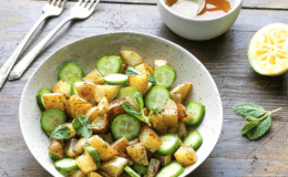 Light, flavorful and very easy to prepare. This salad is made with sumac roasted white potatoes, crunchy Persian cucumber, fresh mint and light dressing. The dressing is made with just four simple ingredients – oil, lemon juice, sweet paprika and salt. Perfect for any time of the year, this salad is vegetarian and gluten free. You can enjoy it on its own, or serve it with white fish or chicken.