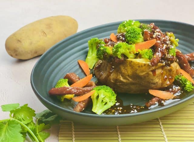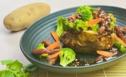 Enjoy this baked potato with beef and broccoli, a tender beef stir fry with broccoli, ginger, carrots, garlic, and soy sauce stuffed into a fluffy baked potato.