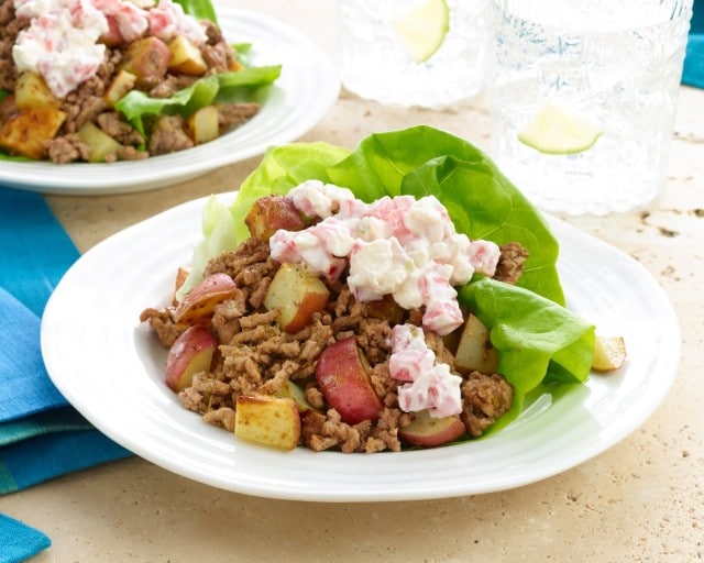 4. Remove leaves from the head of lettuce; wash and dry. Place lettuce on four plates. Top with beef-potato mixture and tomato-yogurt sauce.